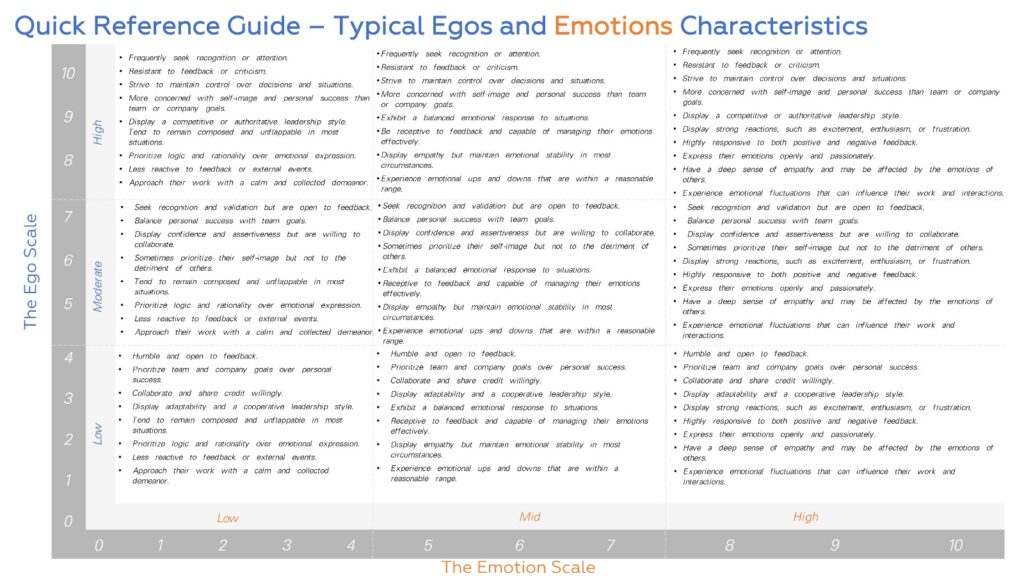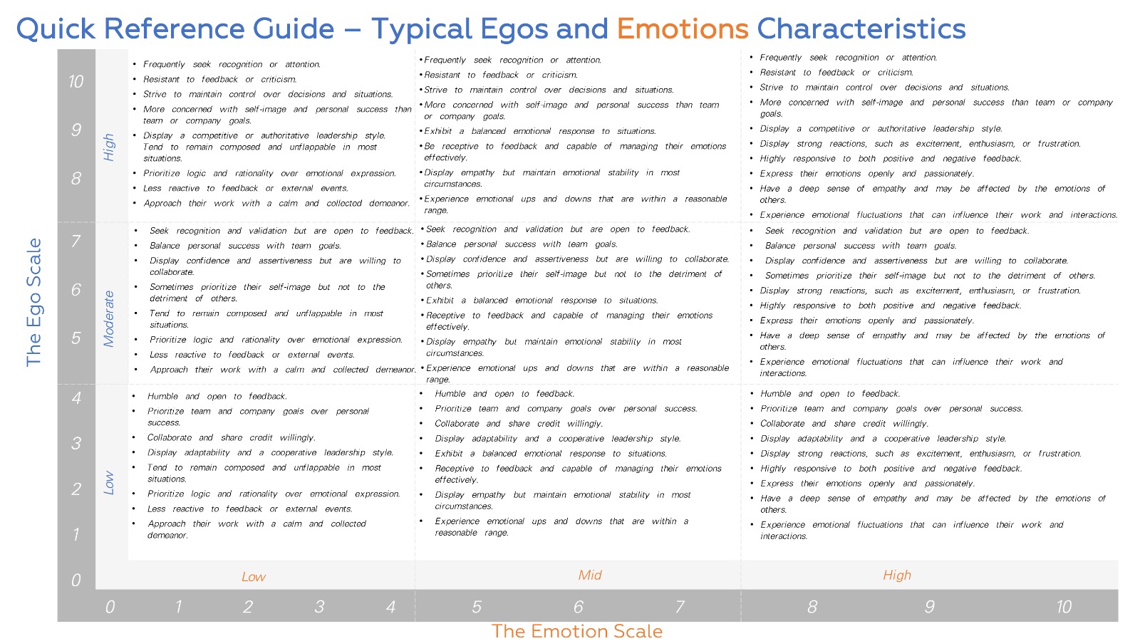 Instructions: To support the learning journey, we’ve outlined some of the characteristics of Egos and Emotions in a quick reference format that can be aligned with the Egos and Emotions Scale